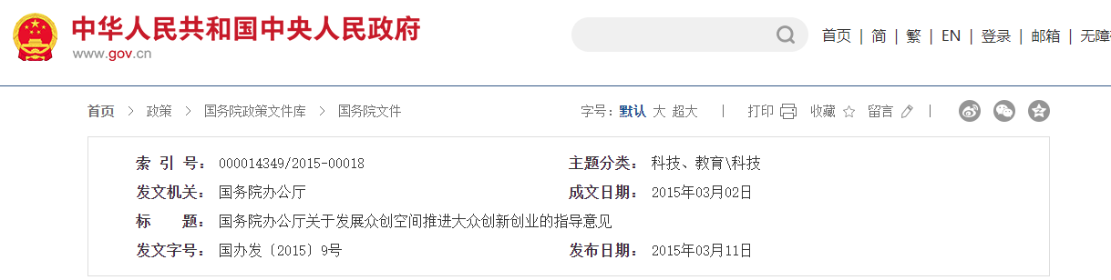 国务院办公厅关于发展众创空间推进大众创新创业的指导意见